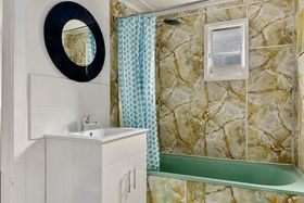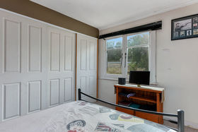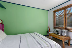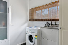 There are two bedrooms, the main with built-in cupboards and the second with some shelving. A small sunroom with storage shelves leads out from the kitchen to the retro bathroom that has a shower over the bath and a modern vanity. This then leads through to the laundry and the w/c.