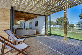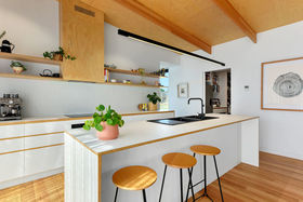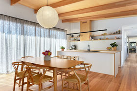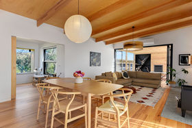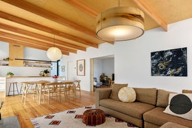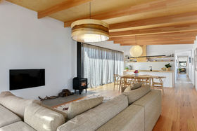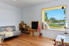 Stepping through the bi-fold doors that lead into the living area you are immediately drawn to the personally designed gorgeous timber light fitting which compliments the Hoop Pine plywood ceilings and Tas Oak wooden floors. The all white kitchen with its clean lines and hint of timber through the benches and drawers create a beautiful but practical workspace complete with breakfast bar and modern stainless steel appliances. Opposite the kitchen is a fantastic walk-in butler's pantry providing plenty of room for groceries and that extra storage. Next door is a playroom/study/fourth bedroom, a wonderful space for the children to play close to you, also providing that extra sleeping room for family and friends.