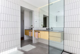 Moving along the passage is a state of the art bathroom complete with floor to ceiling tiles, walk-through powder room area with separate w/c and vanity. and following through into the main bathroom with large walk-in shower, vanity, built-in bath with lovely timber surrounds incorporating storage.