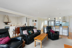 The spacious open plan living captures all the amazing views on offer which makes the daily grind of cooking in the modern kitchen enjoyable. There is ample cupboard and bench space including a large island bench with built-in breakfast bar, a large corner pantry, an extra separate bench housing the dishwasher, a wall oven, a large double fridge which goes with the home and built-in wine racks. Off the lounge/dining area are glass sliding doors leading out onto the huge deck which has a roof incorporating down lights, covering half to maximise the use for all year round entertaining. Imagine sitting out there on a balmy evening with a glass of wine enjoying those beautiful sunsets that are frequently on offer.